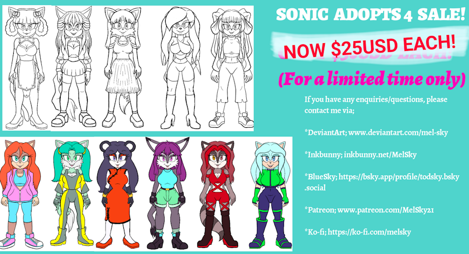 They have now been reduced to $25USD each* (any changes to their species, colours, and/or outfits will cost extra).