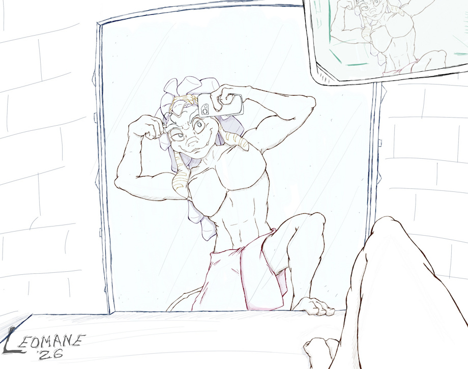 Whew just a little bit of some context for why Benn might be doing this, I did have an idea to slip Vower in the background catching him in the act and getting Benn to blush bbbuuuuutt I settled for trying my hand at some mirroring and semi first person stiff with the leg coming into frame there along with the small camera being visible! And hoooo boy yeah you'd believe that I have an alt planned >:D