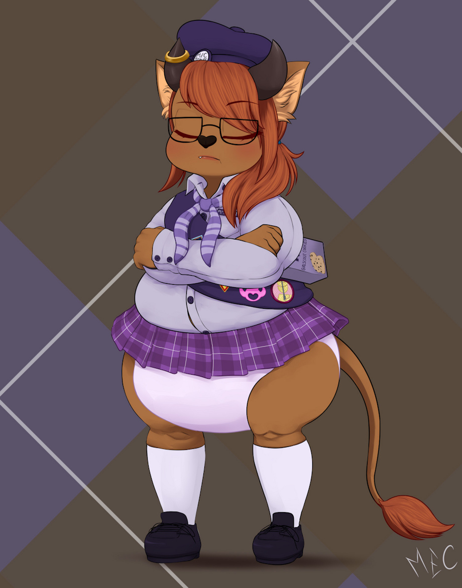 Silver-Writing-Desk got a Girlscoutification, their cow OC turned into a lil', fat, diapered MC Scout, with a few variants to work for her PNGtuber videos.