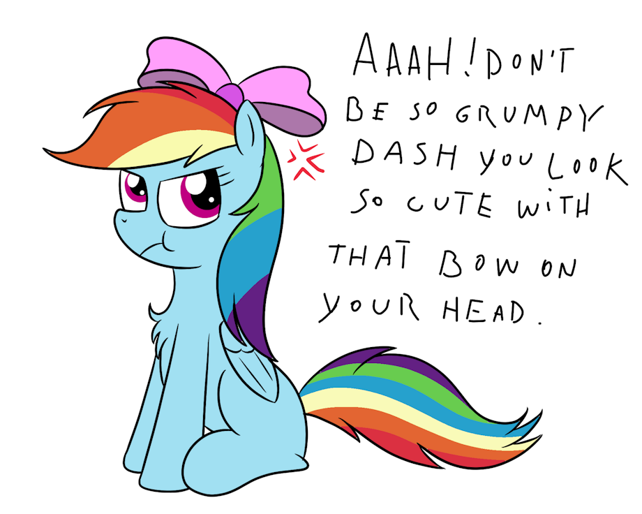 Rainbow Dash is grumpy when wearing a cute pink bow on her head.