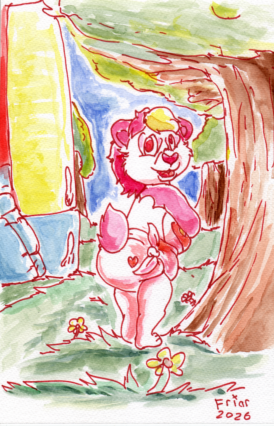Watercolor illustration of Token Heart Bear the diapered panda care bear cousin with tied on diaper standing under a tree next to a bouncy house in a forest.