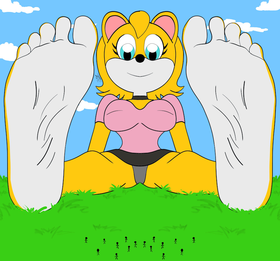 Here, we have my Mobian OC gal May the Fox as a giantess in a park showing off her feet to a group of micros in a park about to wiggle her toes.