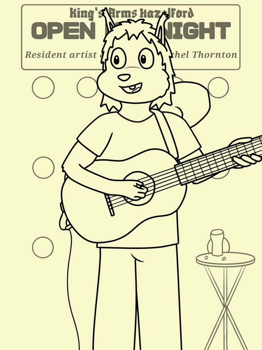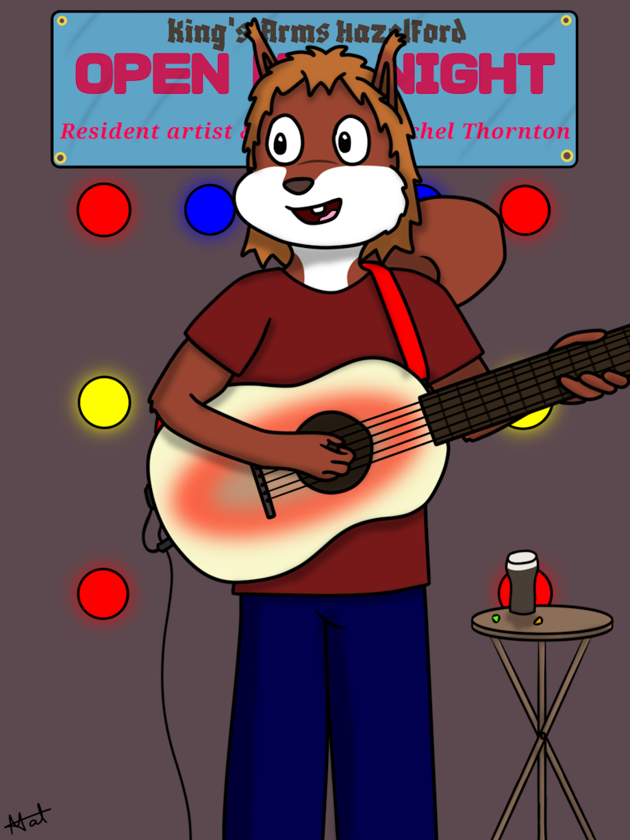 Late teen (over 16 at least) Rachel performs at her local pub's Open Mic Night. Not only does she perform, but she is the Artist in Residence and Compere for the event. Maybe it'll lead to something in the future, who knows...