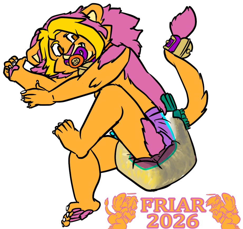 Illustration of Friar the wet and messy diapered lion sucking on a pacifier laying on his side on his race car bed. "Wanna have a stinky nap? In yuckypants?"