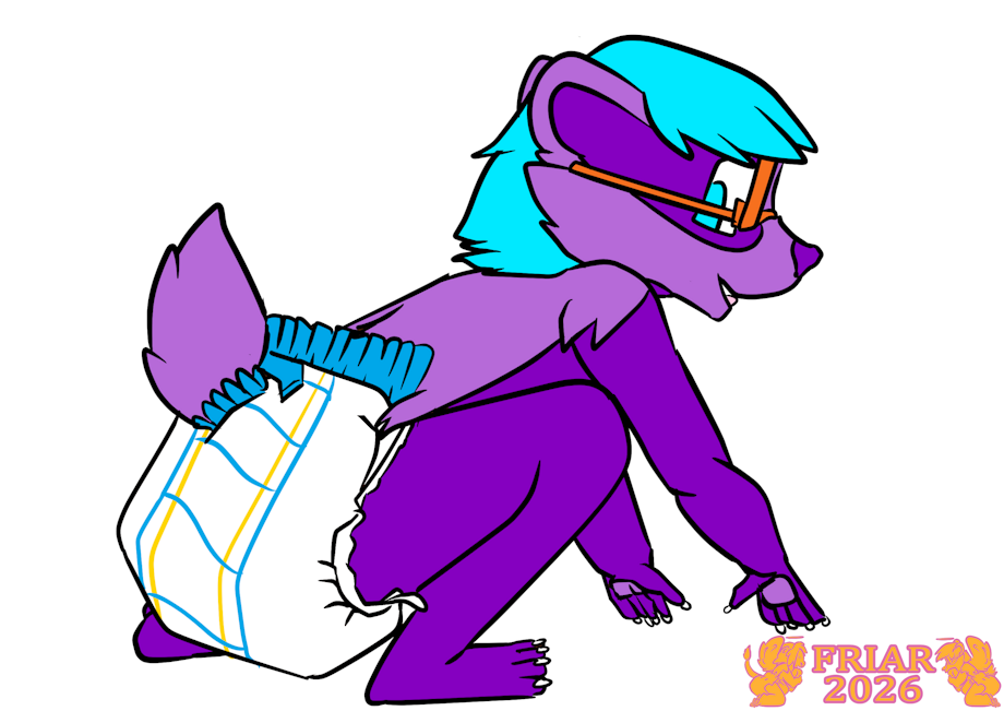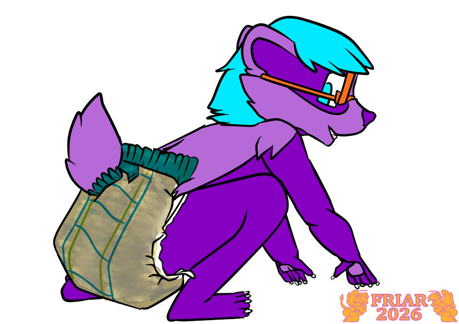 Illustration of Everett the wet and messy diapered badger crouching down in the forest near a hollow log, where a mushroom is visible. "Gotta make yuckypants so the mushrooms know to trust you."
