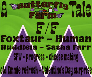 That meant Sasha arrived back at Butterfly Farm in only three hours instead of the usual three and a half to four hours the trip to and from the village usually took. Her calm smile turned into a cheerful grin as she turned into the driveway, a laugh escaping her at the sight of Buddleia laying on the chest and tummy of her quadruped lower body by the rabbit runs and hutches, but jolting upright to her four feral feet and staring with her muzzle hanging open and her golden eyes round and wide as she saw Sasha coming up the driveway in the dark green Chevrolet. She cheerfully beeped the horn as she rolled past the stunned vixen-taur and parked in the large open area in front of the large shed.