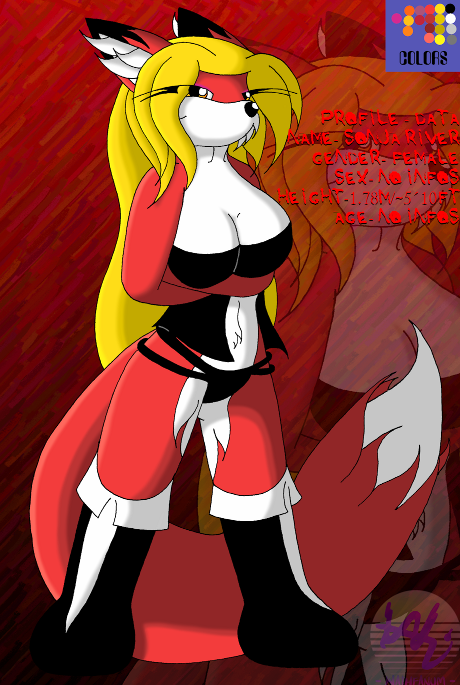 - Character Main Data Art Universe - Anum Chaos Name - "Fire-bitch!", Sonja, Red-one FULL Name - Sonja River Gender - Female Sex - No Infos given Height - 1.78M/~5´10Ft Age - No Infos given Race/Class - Vixen from the Firefox Tribe, Anum IF there would be a theme song - https://www.youtube.com/watch?v=EJMYdch314c (with a HIGH undertone of sarcasm)