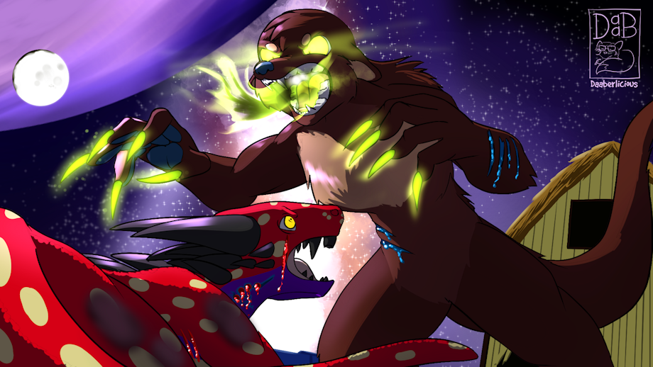 Sage The Wulver gets into a fight with an intruding Beta-4 gervukk. It's losing.