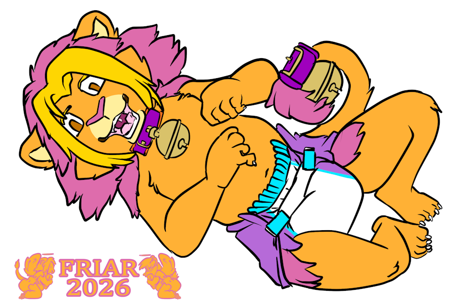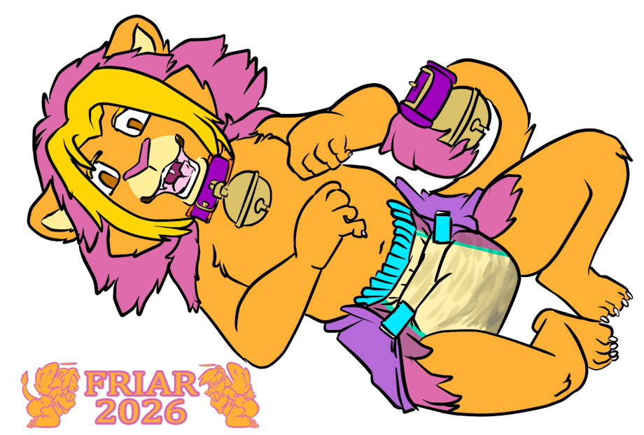 Illustration of Friar the wet and messy diapered lion flopped on his back on the changing table. "Rawr! Can I get out of a change by being cute?"
