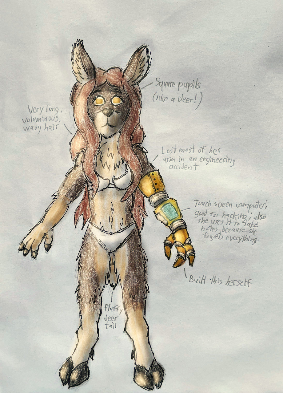This is part of an ongoing project to turn some of my old "characters" into proper characters. I've been drawing this deer girl in some of my bondage art for quite some time, but she didn't really have a clear cut personality in my head, and although I always liked her color palette, she never really had any distinguishing characteristics that really made her unique or immediately recognizable. I'm trying to expand my cast of characters that I draw by upgrading some of my old characters from "bodies" to "characters." In Amber's case, I settled on her being a techie! She's quiet and soft-spoken; most people don't assume upon first meeting her that she's a tech genius who is skilled with coding and robotics. She has an engineer's mind; she's constantly trying to find "fixes" for everything and constantly involuntarily tries to optimize everything, from breakfast to relationship. She enjoys bondage (obviously, since I'm a bondage artist). She likes the occasional bondage hijinx as a way to force her mind to quiet down and stop trying to fix and optimize everything. She can't help but seeing everything as a problem to solve--but there are no problems to solve when you're tied up ;3 Also my heck please forgive my handwriting I don't know why I didn't just type the notes instead of writing them by hand.