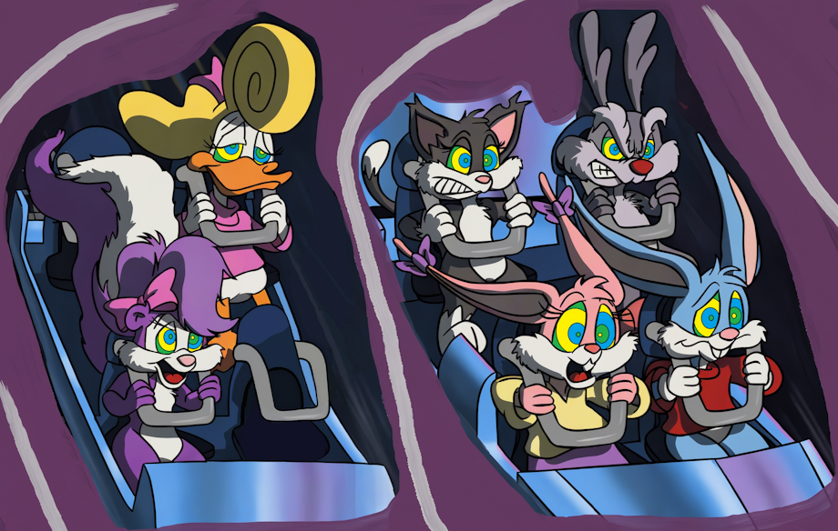 An Edit Of A Commission Made By Kumata of The Tiny Toons' Buster Bunny, Babs Bunny, Fifi La Fume, Calamity Coyote, & Shirley The Loon (and Rita The Cat from Animaniacs) Riding A Unique Version Of Rock n' Roller Coaster, All Hypnotized & Tripping Bulls!