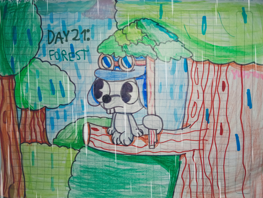 For today, I decided to draw Cuppy the flying squirrel sitting on a tree branch during a rainstorm, sheltering under a homemade umbrella he made from a stick and leaves 🌲🌳🌱🐿️..