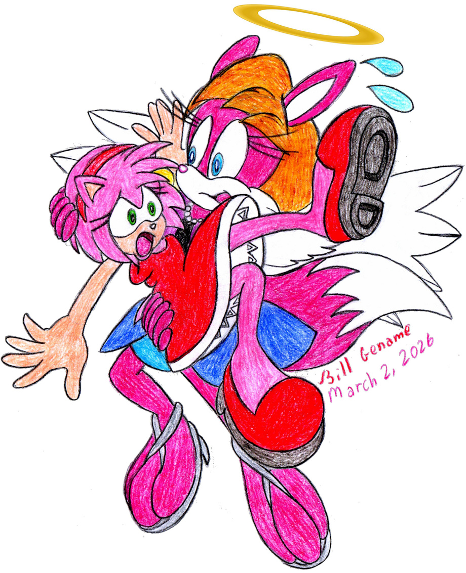 Inspired by a scene from late into the third episode of Sonic X, showing that even in her Super Seraph form, Lisa can still break a sweat going out of her way to save Amy from certain doom. It really goes to show how caring Lisa is for her rosy friend.