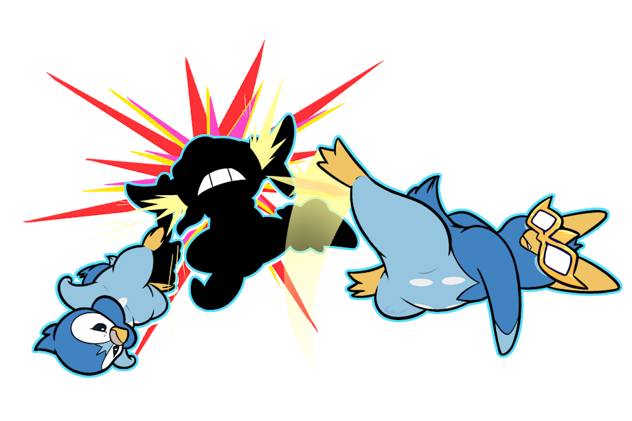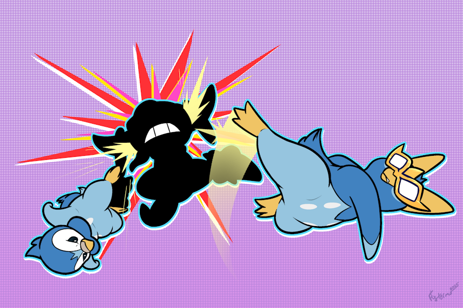 With her falling down, Rook charged in. It's his turn! His mom was not far behind, ready to strike with him.