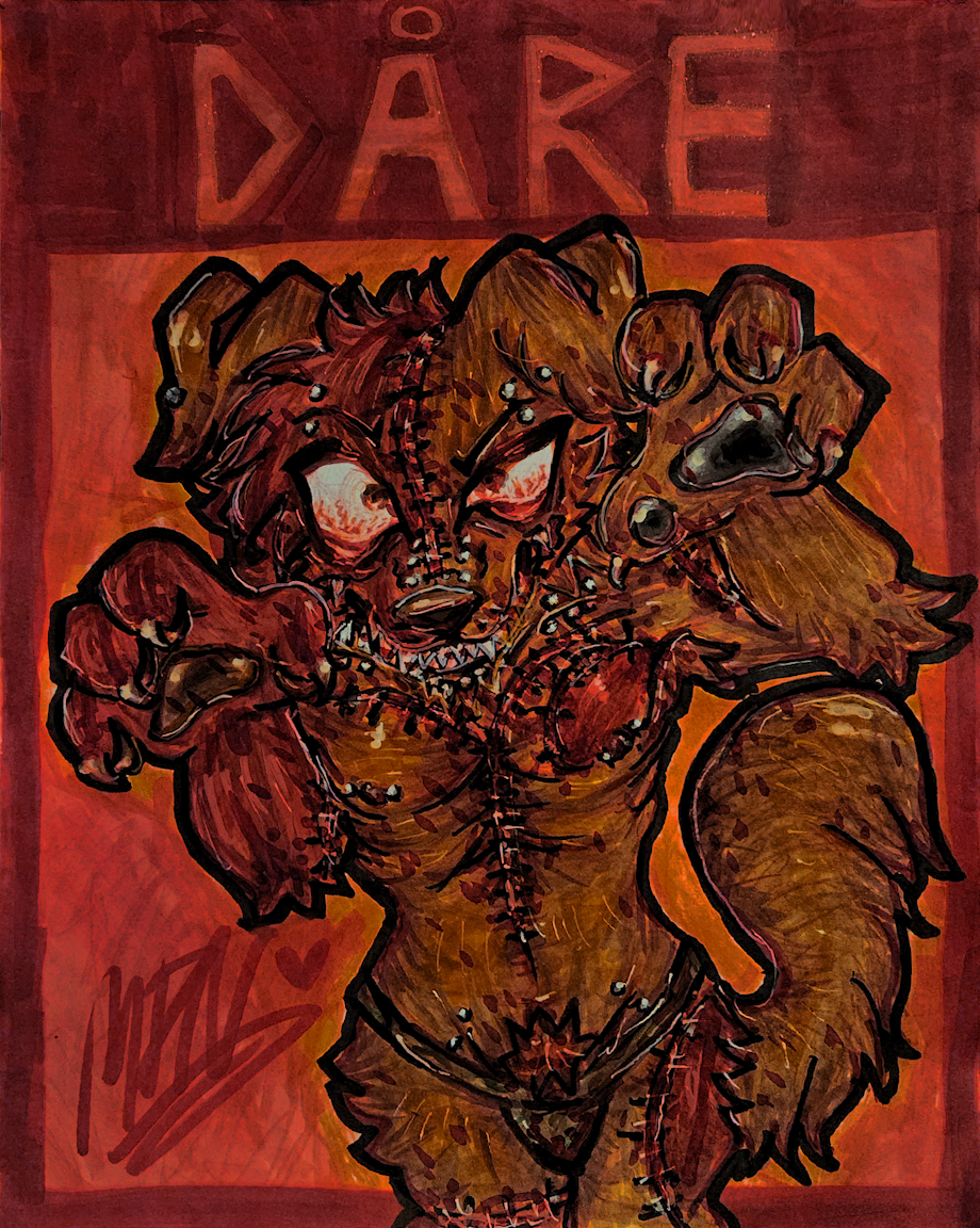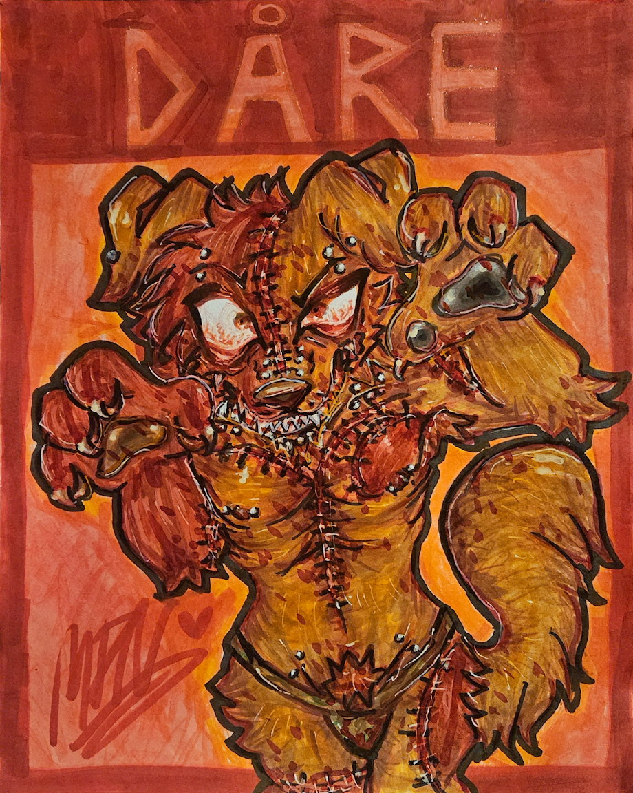 his name is Dåre Maniker and hes a manic undead red golden retriever