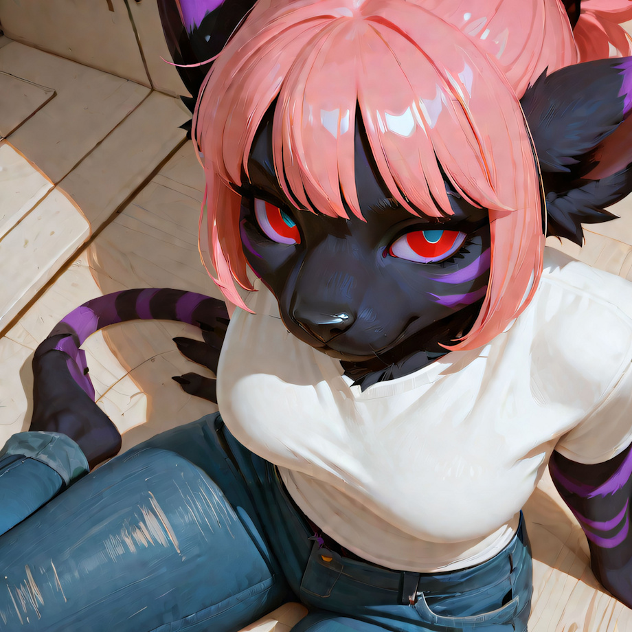 HYPERREALISM, masterpiece, high quality, detailed fur, high detail, 32k_uhd, fine details, intricate details, highest quality, perfect anatomy, perfect face, detailed face, detailed eyes, perfect eyes, very aesthetic, concept art, masterpiece, best quality, amazing quality, ultra-HD, high resolution, ultra-detailed, absurdres, highly detailed, detailed eyes, source_furry, no lineart <lora:(1) FenrisXL Lighting:1> <lora:(1) Mjölnir (SDXL Lighting):1> <lora:photorealistic anthro 2:1> furry (solo, 1girl, closeup, face focus, white tshirt, jeans:1.7) <v31ur4> (female:anthro:tall:athletic:voluptuous:gatomon:1.4), (pink hair, short hair, ponytail:1.4), (black fur, medium breasts:1.4), (red eyes, black pupils:1.4), (purple hands, purple feet, black nails:1.3), (striped body, purple stripes:1.4), (toned legs:1.3), (digitigrade:1.2), (happy trail, pubes:1.3) Negative prompt: bloodshot eyes, arms behind back, hands behind back, blurry, blurry background, bad anatomy, bad hands, three hands, three legs, bad arms, missing legs, missing arms, poorly drawn face, bad face, fused face, cloned face, worst face, three crus, extra crus, fused crus, worst feet, three feet, fused feet, fused thigh, three thigh, fused thigh, extra thigh, worst thigh, missing fingers, extra fingers, ugly fingers, long fingers, horn, realistic photo, extra eyes, huge eyes, 2girl, amputation, disconnected limbs, worst quality, normal quality, low quality, low res, blurry, text, watermark, logo, banner, extra digits, cropped, jpeg artifacts, signature, username, error, sketch ,duplicate, ugly, monochrome, horror, geometry, mutation, disgusting, jpeg artifacts, , NEGATIVE_HANDS ac_neg2 p0rnXL-neg DeepNegative_xl_v1 BeyondV3-neg Steps: 30, Sampler: DDIM, Schedule type: SGM Uniform, CFG scale: 3, Seed: 2976720228, Size: 512x512, Model hash: 1a859ef789, Model: NOVAYiffymix_v62, Denoising strength: 0.25, ADetailer model 2nd: face_yolov8s.pt, ADetailer confidence 2nd: 0.3, ADetailer dilate erode 2nd: 4, ADetailer mask blur 2nd: 4, ADetailer denoising strength 2nd: 0.4, ADetailer inpaint only masked 2nd: True, ADetailer inpaint padding 2nd: 32, ADetailer version: 25.3.0, Hires upscale: 1.5, Hires steps: 20, Hires upscaler: 4xUltrasharp_4xUltrasharpV10.pth, Lora hashes: "(1) FenrisXL Lighting: c49df8024095, (1) Mjölnir (SDXL Lighting): 368d428918ac, photorealistic anthro 2: bed53d4c8b68", TI: "NEGATIVE_HANDS, ac_neg2, p0rnXL-neg, DeepNegative_xl_v1, NEGATIVE_HANDS, ac_neg2, p0rnXL-neg, DeepNegative_xl_v1", Version: f2.0.1v1.10.1-previous-224-g90019688 |
