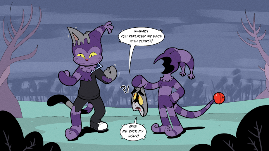 Mask comm for Scattered_Katz! Trick has ripped off Scatters' face and replaced the blank space with its own! Poor Scatters