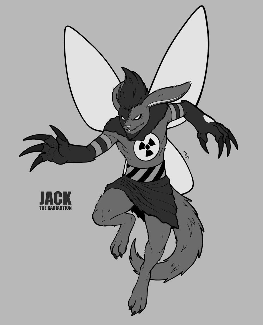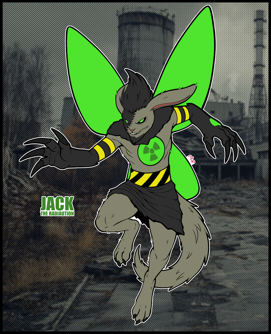 Jack the Radiaution is an original character created by RachelTheFictionkin, based on the fan-made Radiaution species by DeviantArt user garbagekeeper (Necr0wmancer) from MonsterMMORPG. Genetically engineered for war, Jack is a radioactive, rabbit-like creature with nuclear and dark abilities. He escaped a military facility to avoid becoming a weapon and now resides in an abandoned nuclear power plant with other creatures. Despite his dangerous powers, Jack is well-mannered and avoids using them, though his presence has made him a local cryptid due to reported sightings.