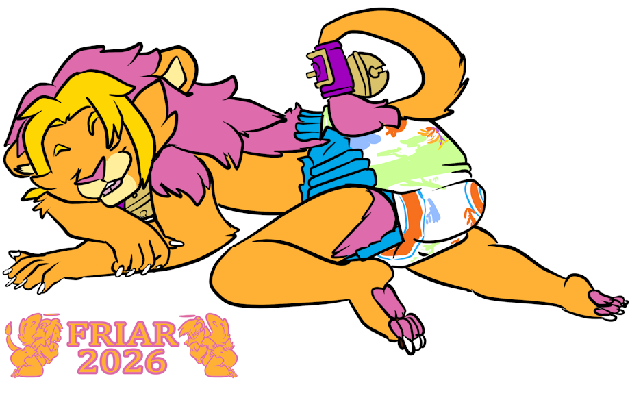 Illustration of Friar the wet and messy Kion pullups wearing lion flopped in his large bassinet, napping. "Zzz...Help, Kion, there's been a mudslide..."