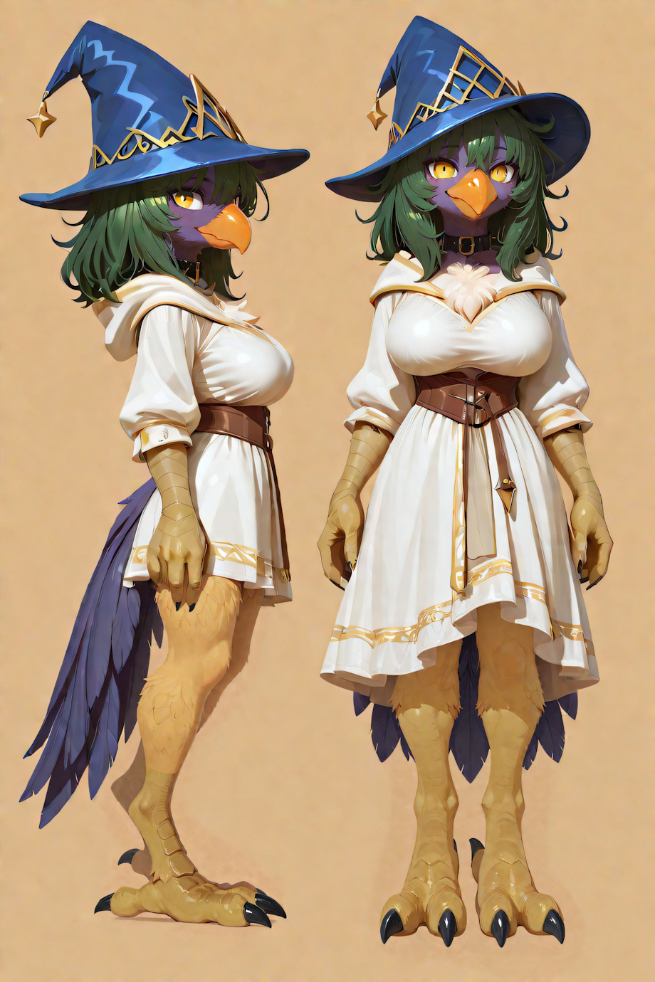 HYPERREALISM, masterpiece, high quality, detailed fur, high detail, 32k_uhd, fine details, intricate details, highest quality, perfect anatomy, perfect face, detailed face, detailed eyes, perfect eyes, very aesthetic, concept art, masterpiece, best quality, amazing quality, ultra-HD, high resolution, ultra-detailed, absurdres, highly detailed, detailed eyes, source_furry, no lineart <lora:(1) FenrisXL Lighting:1> <lora:(1) Mjölnir (SDXL Lighting):1> <lora:photorealistic anthro 2:1> furry (solo, 1girl, full body:2) (wizard hat, white dress:1.4) <lora:character_Sheet_XL:0.8> character sheet, Multiple views, simple background multiple expressions, different emotional expressions, looking at viewer <1um4> (female:anthro:slender:voluptuous:chocobo:1.4), (medium hair, messy bangs, green hair:1.4), (purple feathers:1.4), (orange beak:1.3), (yellow eyes, black pupils:1.3), (digitigrade:1.2), (scuted legs, talons, scuted arms:1.4), (large breasts:1.3), (black collar:1.3), (tail feathers:1.3) Negative prompt: bloodshot eyes, arms behind back, hands behind back, blurry, blurry background, bad anatomy, bad hands, three hands, three legs, bad arms, missing legs, missing arms, poorly drawn face, bad face, fused face, cloned face, worst face, three crus, extra crus, fused crus, worst feet, three feet, fused feet, fused thigh, three thigh, fused thigh, extra thigh, worst thigh, missing fingers, extra fingers, ugly fingers, long fingers, horn, realistic photo, extra eyes, huge eyes, 2girl, amputation, disconnected limbs, worst quality, normal quality, low quality, low res, blurry, text, watermark, logo, banner, extra digits, cropped, jpeg artifacts, signature, username, error, sketch ,duplicate, ugly, monochrome, horror, geometry, mutation, disgusting, jpeg artifacts, , NEGATIVE_HANDS ac_neg2 p0rnXL-neg DeepNegative_xl_v1 BeyondV3-neg Steps: 30, Sampler: DDIM, Schedule type: SGM Uniform, CFG scale: 3, Seed: 3043980454, Size: 512x768, Model hash: 1a859ef789, Model: NOVAYiffymix_v62, Denoising strength: 0.25, ADetailer model 2nd: face_yolov8s.pt, ADetailer confidence 2nd: 0.3, ADetailer dilate erode 2nd: 4, ADetailer mask blur 2nd: 4, ADetailer denoising strength 2nd: 0.4, ADetailer inpaint only masked 2nd: True, ADetailer inpaint padding 2nd: 32, ADetailer version: 25.3.0, Hires upscale: 1.5, Hires steps: 20, Hires upscaler: 4xUltrasharp_4xUltrasharpV10.pth, Lora hashes: "(1) FenrisXL Lighting: c49df8024095, (1) Mjölnir (SDXL Lighting): 368d428918ac, photorealistic anthro 2: bed53d4c8b68, character_Sheet_XL: 4c59246e5115", TI: "NEGATIVE_HANDS, ac_neg2, p0rnXL-neg, DeepNegative_xl_v1, NEGATIVE_HANDS, ac_neg2, p0rnXL-neg, DeepNegative_xl_v1", Version: f2.0.1v1.10.1-previous-224-g90019688 |