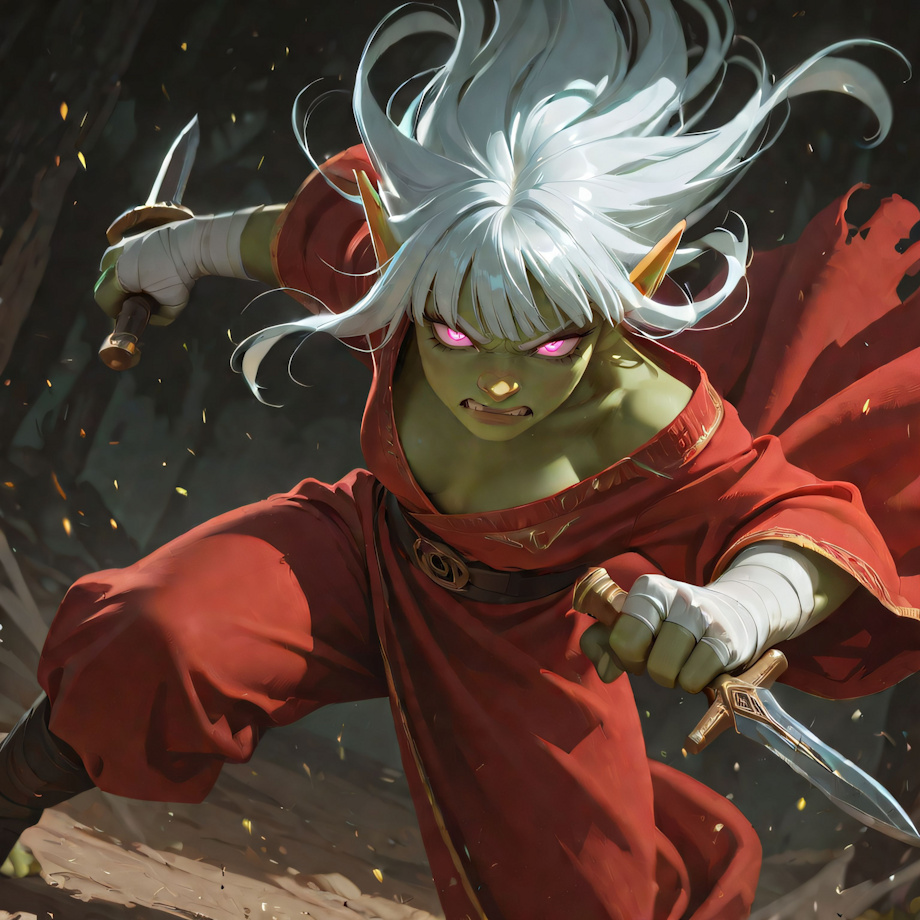 HYPERREALISM, masterpiece, high quality, detailed fur, high detail, 32k_uhd, fine details, intricate details, highest quality, perfect anatomy, perfect face, detailed face, detailed eyes, perfect eyes, very aesthetic, concept art, masterpiece, best quality, amazing quality, ultra-HD, high resolution, ultra-detailed, absurdres, highly detailed, detailed eyes, source_furry, no lineart <lora:(1) FenrisXL Lighting:1> <lora:(1) Mjölnir (SDXL Lighting):1> <lora:photorealistic anthro 2:1> furry (solo, 1girl:2), (red robe, red pants, bandaged hands:1.4) (holding dagger:1.4) (night, glowing eyes, fighting, thrust, dynamic:1.4) <b3114n1> (short:female:athletic:goblin:1.4), (green skin, small breasts:1.3), (white hair, shoulder length bangs, long hair:1.3), (pink eyes, black pupils:1.3), (pointy ears:1.2), (four fingers, three toes:1.3) <lora:(S) Action:1> zdyna_pose Negative prompt: bloodshot eyes, arms behind back, hands behind back, blurry, blurry background, bad anatomy, bad hands, three hands, three legs, bad arms, missing legs, missing arms, poorly drawn face, bad face, fused face, cloned face, worst face, three crus, extra crus, fused crus, worst feet, three feet, fused feet, fused thigh, three thigh, fused thigh, extra thigh, worst thigh, missing fingers, extra fingers, ugly fingers, long fingers, horn, realistic photo, extra eyes, huge eyes, 2girl, amputation, disconnected limbs, worst quality, normal quality, low quality, low res, blurry, text, watermark, logo, banner, extra digits, cropped, jpeg artifacts, signature, username, error, sketch ,duplicate, ugly, monochrome, horror, geometry, mutation, disgusting, jpeg artifacts, , NEGATIVE_HANDS ac_neg2 p0rnXL-neg DeepNegative_xl_v1 BeyondV3-neg Steps: 30, Sampler: DDIM, Schedule type: SGM Uniform, CFG scale: 3, Seed: 2533385200, Size: 512x512, Model hash: 1a859ef789, Model: NOVAYiffymix_v62, Denoising strength: 0.25, ADetailer model 2nd: face_yolov8s.pt, ADetailer confidence 2nd: 0.3, ADetailer dilate erode 2nd: 4, ADetailer mask blur 2nd: 4, ADetailer denoising strength 2nd: 0.4, ADetailer inpaint only masked 2nd: True, ADetailer inpaint padding 2nd: 32, ADetailer version: 25.3.0, Hires upscale: 1.5, Hires steps: 20, Hires upscaler: 4xUltrasharp_4xUltrasharpV10.pth, Lora hashes: "(1) FenrisXL Lighting: c49df8024095, (1) Mjölnir (SDXL Lighting): 368d428918ac, photorealistic anthro 2: bed53d4c8b68, (S) Action: e1cd14f8e7fb", TI: "NEGATIVE_HANDS, ac_neg2, p0rnXL-neg, DeepNegative_xl_v1, NEGATIVE_HANDS, ac_neg2, p0rnXL-neg, DeepNegative_xl_v1", Version: f2.0.1v1.10.1-previous-224-g90019688 |