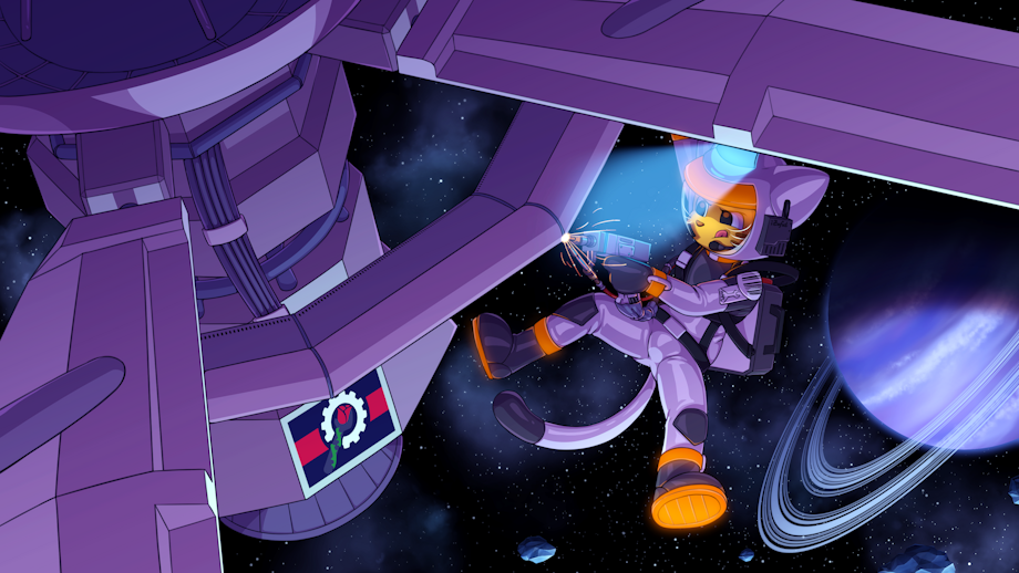 The satellite Meowl is fixing here belongs to the Poseidon Harvest Array, specifically a communication satellite used to coordinate extraction efforts. With laser welder in paw, there’s nothing he can’t fix (except things that take a different tool).