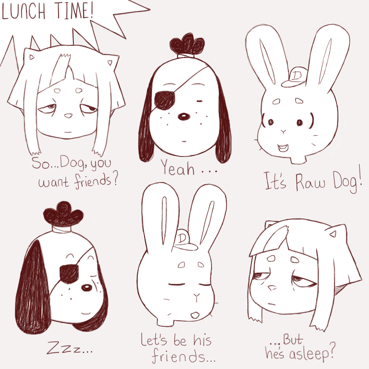 It's a crossover of my 3 characters Nushi the cat, Raw Dog & Sam the bunny!