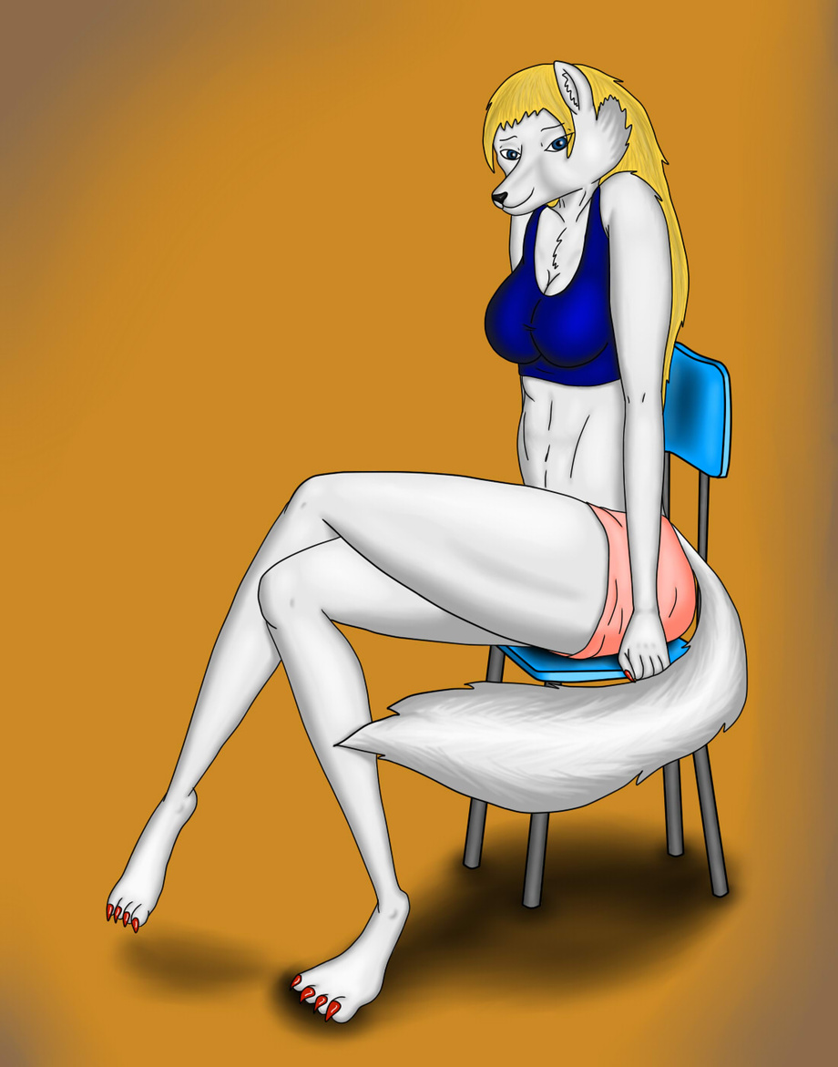 Just my pretty blond arctic vixen Sandra posing nicely in a chair while wearing a tank top and a little pink mini skirt.