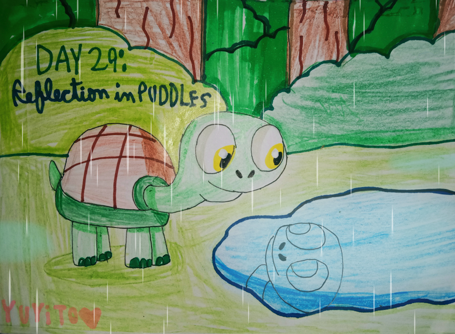 para este día decidí hacer a una tortuga de río quién explorando el bosque cercano se encontró con un charco de agua donde vio su reflejo mientras llovía 🐢🌧️.