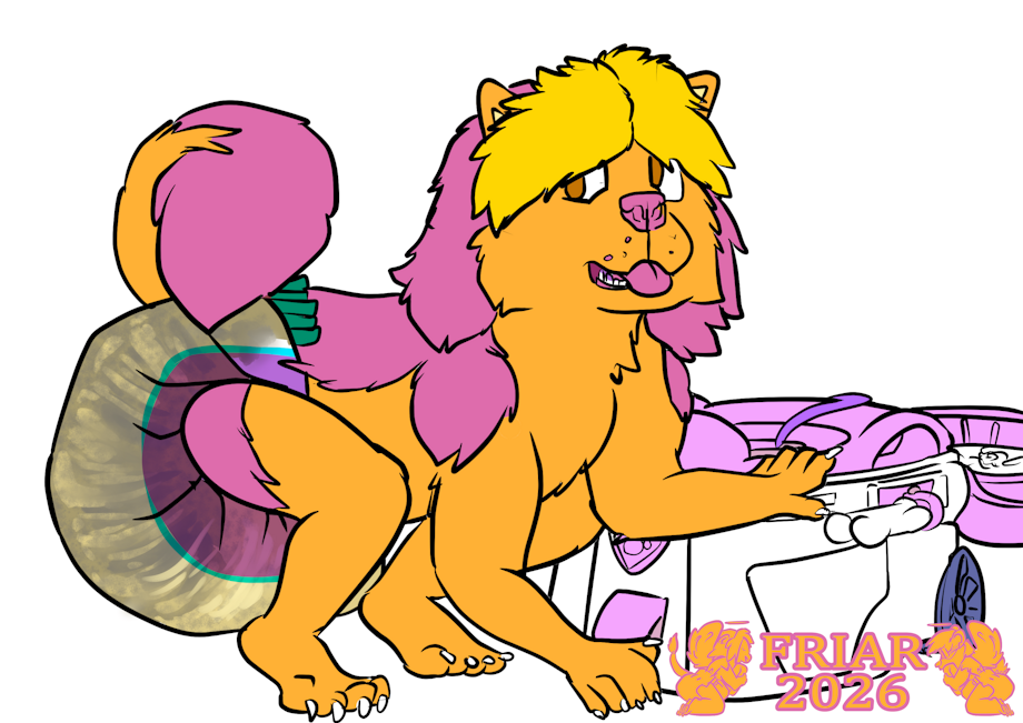 Illustration of Friar the wet and messy diapered TF'd chow chow dog in front of a training potty and training urinal in the pushies puppy school stalls. "Arf! Thanks for refilling my water dish!"