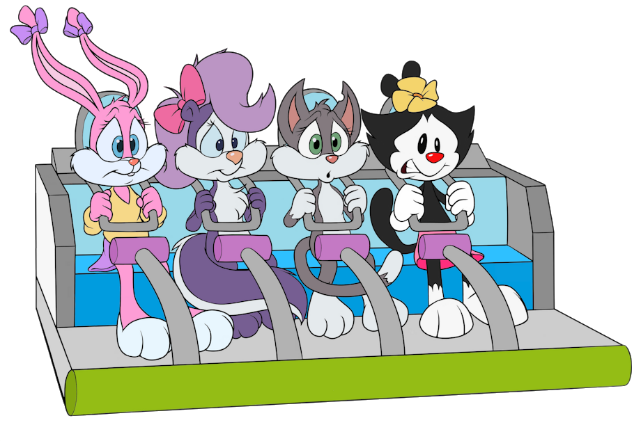 'On A Girls Night Out In A Theme Park, Babs Bunny, Fifi La Fume, Rita The Cat, & Dot Warner Are Trying Out A Looping Coaster Ride, Thay Are Both Feeling A Bit Nervous As The Ride Will Be Looping Around, With Only The Over The Shoulder Restraints Keeping Them Safe.'