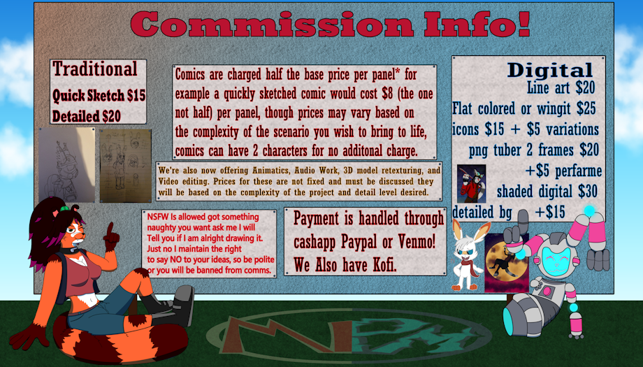 A commission sheet for my prices featuring two of my characters Sasha and L1L1. prices are $15 for a quick rough sketch or a simple png tuber, $20 for a detailed sketch(shading background cleaned up lines minor color) or digital line art, $30 for shaded digital art with a simple bg (not on sheet $25 for a character with no BG) +$15 for a detailed background,