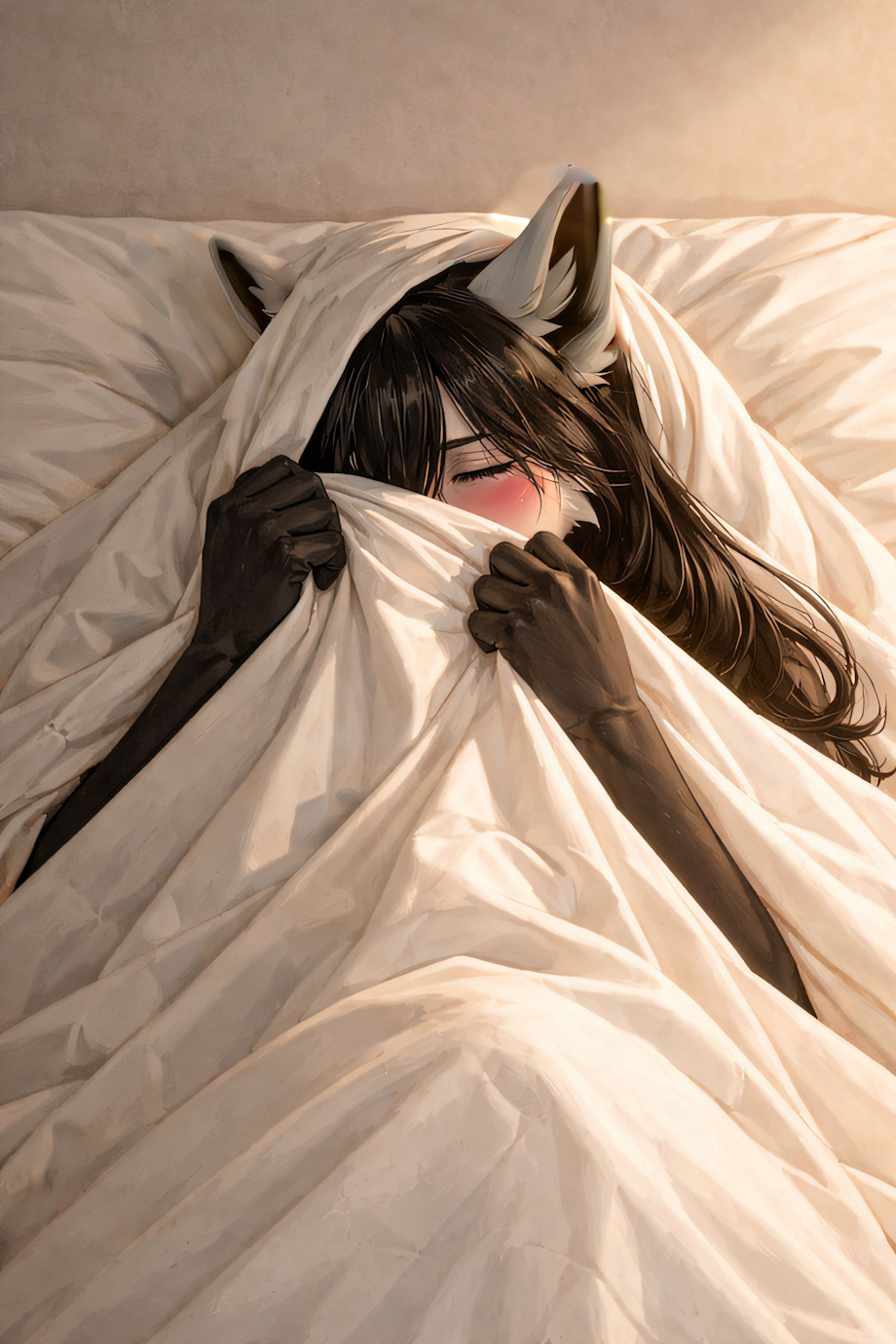 Cast stirred beneath the sheets, her eyes half-lidded, fur tousled into a wild bedhead. She blinked a few times, the blur of sleep fading as her surroundings came into focus—Arthur and Lash sitting across the room, quietly watching her.