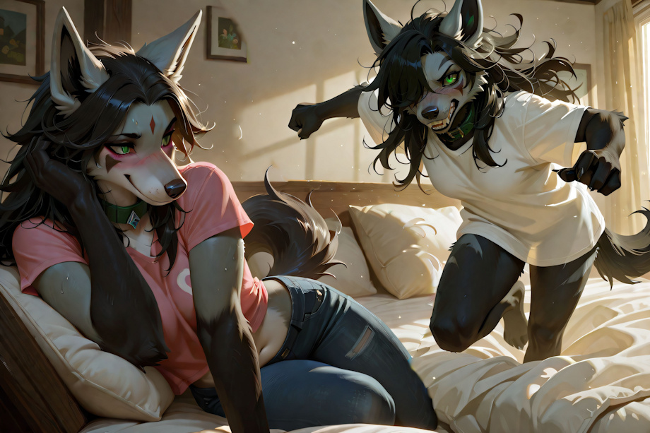 Cast thrashes atop Lash as she lays beneath the blankets, clawing and wriggling as she tries to pull Lash up, tears pricking the corners of her eyes from a mix of frustration and lingering embarrassment. Lash, meanwhile, is laughing uncontrollably, her amusement only fueling Cast’s flailing. Arthur sits nearby, cheeks flushed, a sheepish smile tugging at his lips—red-faced but quietly relieved that the chaos has finally settled back into a familiar, playful rhythm