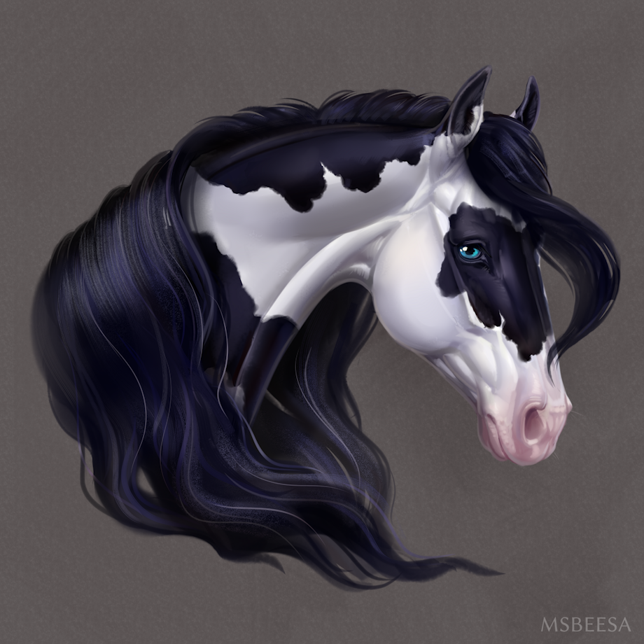 A portrait of a piebald horse