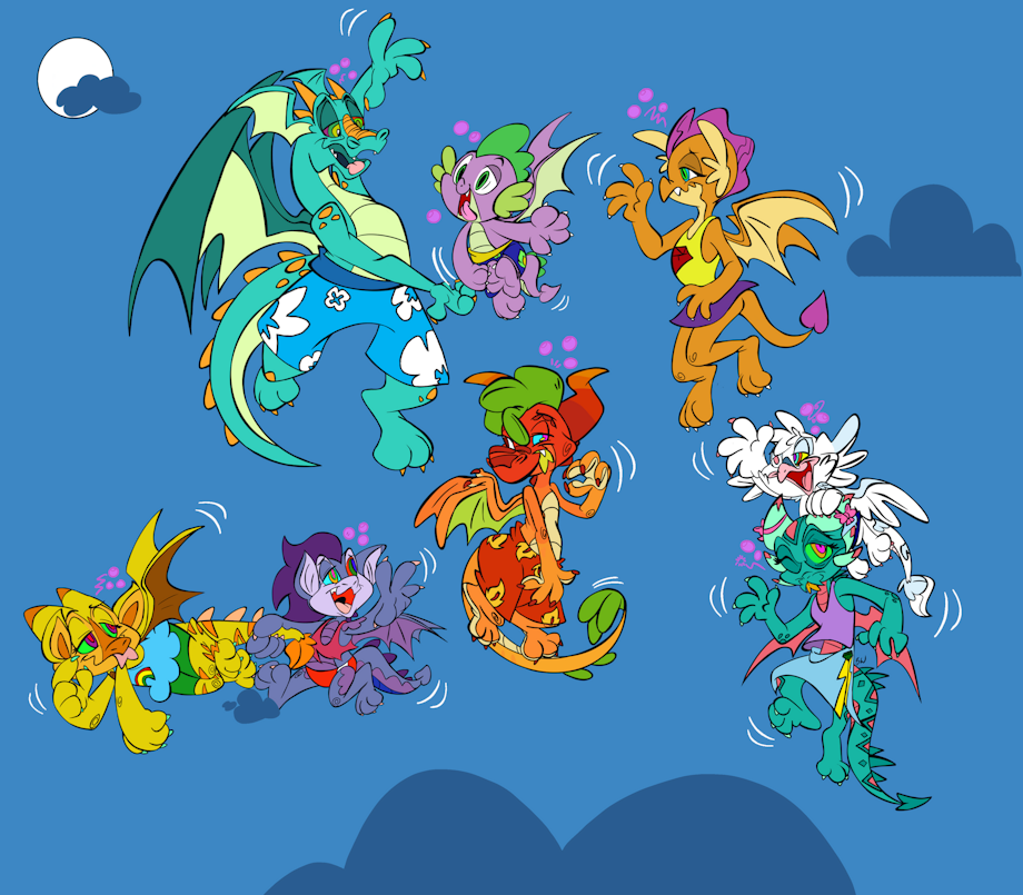 Our tipsy dragon group (Spike/Smolder/Cygnet/Emerald/Iolite/Citrine) coming across a tipsy dragon duo (Victor Sizzle/Peepo) during their night flight. XD