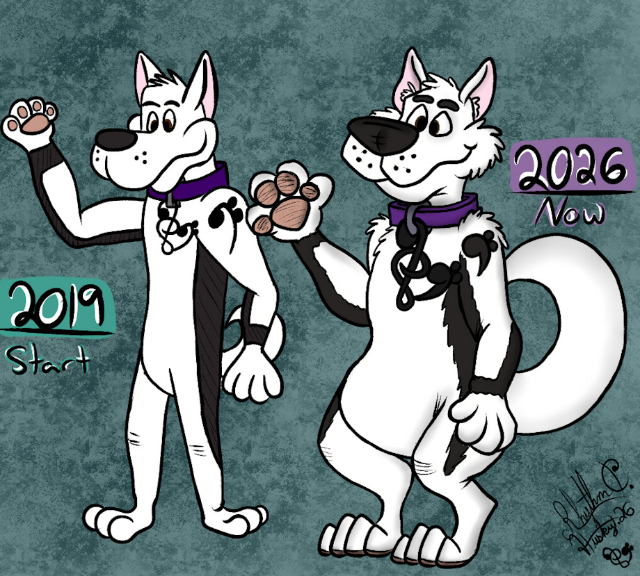 Closing out the Rhythm husky's 7th Anniversary here is comparison of when he looked like from the start to what he looks like now a total 180 difference in art stlye it fun to see how our fursona change over time as we progress in art.