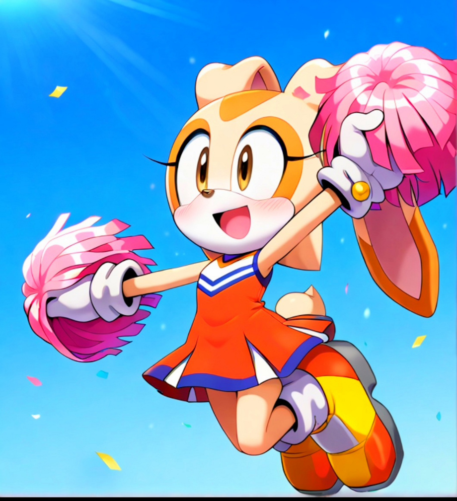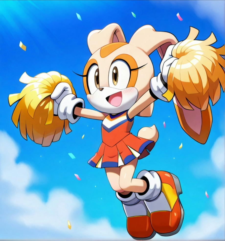 Cream the bunny, cheerleader, 1girl, solo, celebrate, confetti, balloons, smiling, jumping, cheering, legs up, legs in the air, pom poms, Furry, furry female, animal ears, animal nose, rabbit ears, rabbit girl, dress, tail, white gloves, sleeveless, multicolored fur