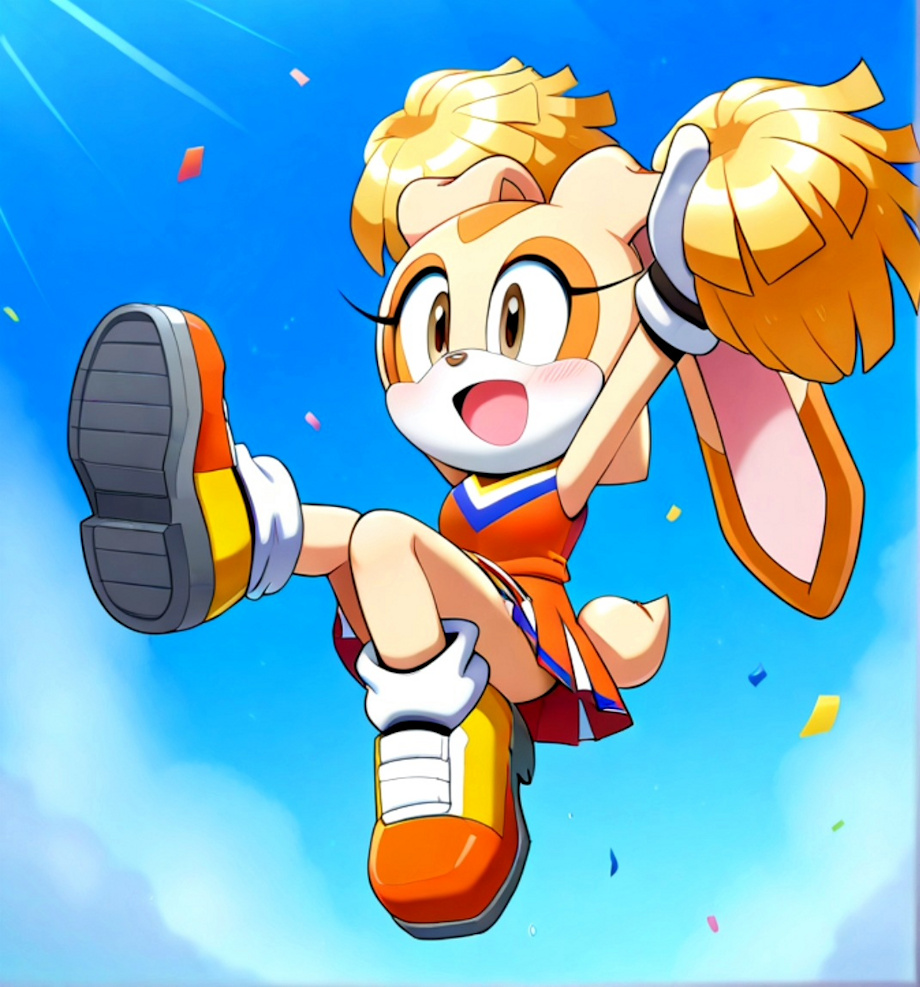 Cream the bunny, cheerleader, 1girl, solo, celebrate, confetti, balloons, smiling, jumping, cheering, legs up, legs in the air, pom poms, Furry, furry female, animal ears, animal nose, rabbit ears, rabbit girl, dress, tail, white gloves, sleeveless, multicolored fur