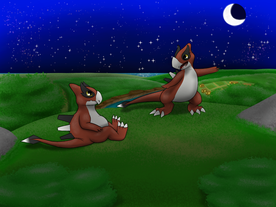 As I wondered earlier, I wasn't sure how fat manifests on creatures like Trishout, but I did want to make Shrunnek (pointing to the town/moon) skinny and their companion chunky, so it's a bit of an experiment in making different body types work visually in creatures not expected to have many differences.