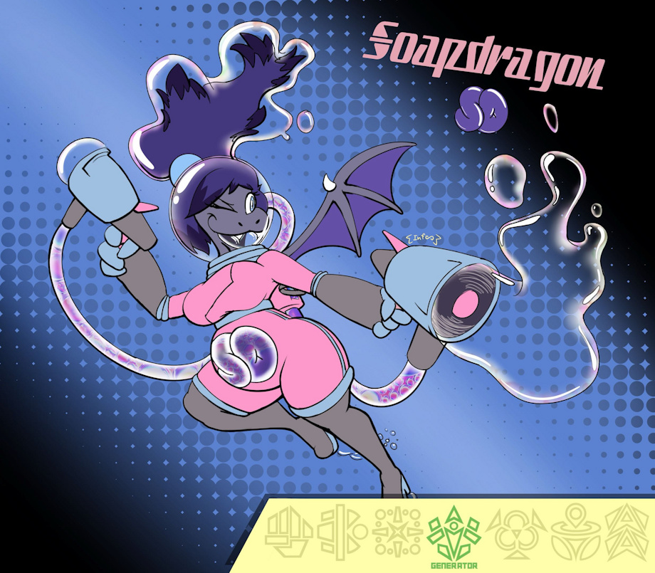 A dragon from the far reaches of space, Stella grew up in a low-gravity habitat. The origin of her bubbly-breath isn't really know (cosmic rays maybe?), but her bubbly personality makes for a cheerful, positive influence on everyone around her. Her main mode of heroing are her high-tech bubble pack and bubble blasters, designed specifically to channel and utilize her bubble's many quirks. The equipment even uses the natural bubble reservoir in her stomach to great effect. Truly a neat and clean heroine for the ages.