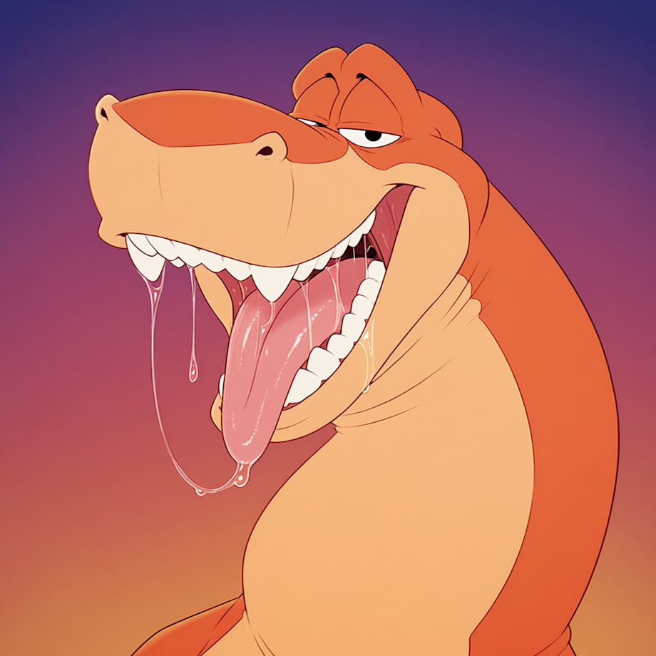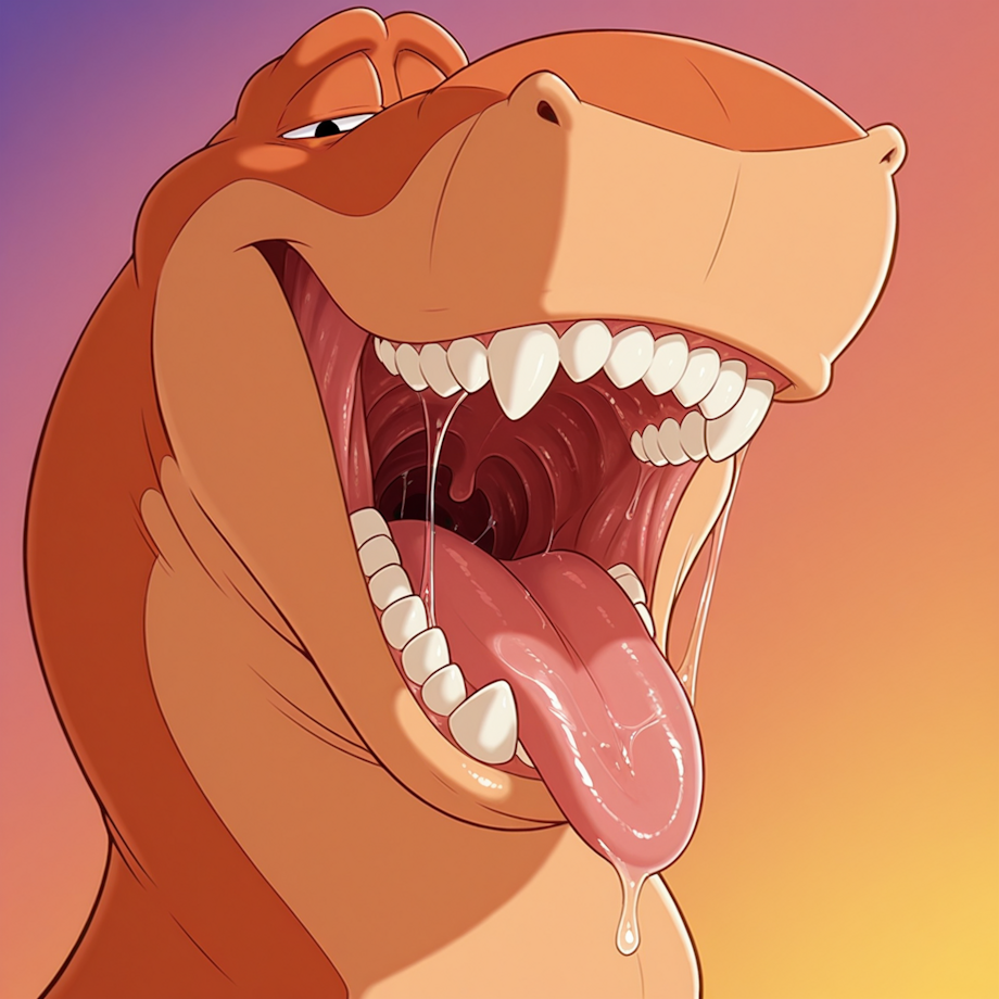 zPDXL3, <lora:cfg_scale_boost:0.4>, <lora:rexwerebackver2_il:1>, rexwerebackver2_il, dinosaur, male, orange skin, two tone skin, black eyes, teeth, (semi-feral), <lora:Mawshot:1>, mawshot, tongue out, saliva, mouth wide open, uvula,