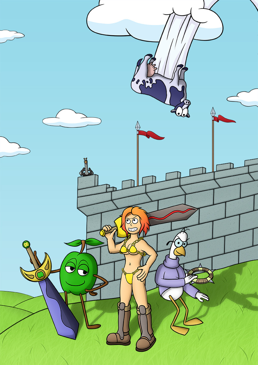So here are the 3 main characters of the comic (Anita is placed in the middle for the sake of symmetry height-wise), posing in front of a castle, replicating the bit from the famous Monty Python movie. If you pay attention, you will notice one of the people from the castle having a suspiciously long neck, and perhaps some retro video game fans will recognize the cow that I put there.