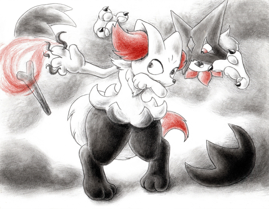 Ori lunges forward at her, knocking her to her knees and tightly wraping her arms around her neck! Embers drops her firestick and it flames out, vanishing in the black smoke. Embers: Argh! grrh... Ori: I'm not the one who's going to be pushing daisies you witch! Embers: Arhh!!! Let!! Me! Go!!! AAAHH!!! AHH!!! Ori: Shut up! Ori squeezes and tighten her arms and pushes her right hand paw into Embers' cheek. Embers: aahh...whimpers... SNAP! Embers: ...urk... Embers final breath slips from her body and her weight begins to weigh down on the Meowscarada. Ori: huff huff Are you dead?