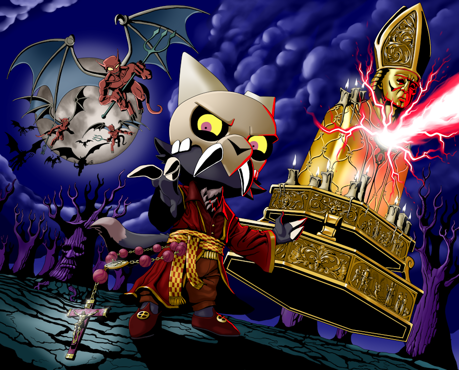 Anyway, more details on this particular drawing: -The King of Demons cannot "summon" demons, he can call them to himself. They'll burrow a hole out of the earth and climb out of Hell when he calls to them, or if they're nearby, they'll fly to his location as seen here. He can't do the teleport/wormhole stuff. -The floating statue guy is a reliquary containing the blood of a bishop which, through multiple miracles and blessings, is animated with some limited intelligence and King can command it around, and it fires lasers. Reliquaries are museum storage pieces that contain the artifacts of an important Christian figure, such as the blood of a bishop, a mummified organ of a cardinal, a piece of clothing owned by a priest. In this case, it's blood. There's a little viewing window to the inside of reliquaries, and monks on pilgrimages will press their eyes against the glass window to take a look at the artifact. In this case, the window functions as a tank barrel, and through blood magic, is able to fire a laser at enemies of Christ. The miracle blood is also able to cause a shockwave and knock enemies off of itself if they were to climb on, and it can form a blood funnel and heal allies like a bloodbag and cause cells to regenerate. -King's rosary is also a powerful artifact that was constructed and blessed by the vatican as a gift. It's too big for him and it floats, so as to not rub against the ground and be disrespectful.