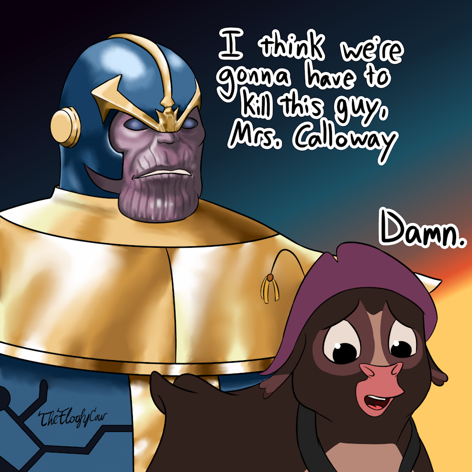 I really enjoy the meme of the "Gonna Have to Kill This Guy", so I wanted to make my own. As to why I chose these characters... I don't know. I like Thanos and Mrs. Calloway. So why not. I know she isn't shaded at all, but I think it's kind of funny with how different they are.