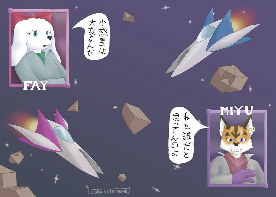 Desde o ginásio, gosto muito de Star Fox, e, como é cheio de personagens furries, quis desenhar um pouco. Hoje escolhi estas duas personagens misteriosas: Fay e Miyu. O general Pepper pediu pra elas se encontrarem com a equipe Star Fox, e elas se encontraram no cinturão de asteroides.