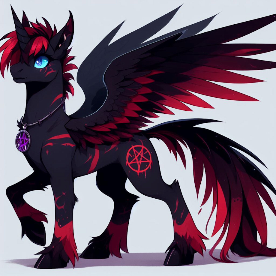 A stylized dark-colored winged pony with red accents stands centered in the frame, facing left in a three-quarter profile. Its mane and tail are spiky and a vibrant red, contrasting with its black body. Large, feathered wings, also black with red tips, are spread upwards and backwards. The pony has striking blue eyes and a single horn on its forehead. It wears a silver chain with a large, purple gem pendant. Red, sharp markings streak across its body, and a prominent red pentagram with dripping effects is visible on its flank. Red fur or feathers adorn its legs and hooves. The background is a plain, light gray. The lighting is even, highlighting the creature's form and the sharp details of its design. The overall atmosphere is dark fantasy, with a bold and edgy aesthetic, rendered in a digital art style. The perspective is eye-level with the pony, emphasizing its powerful stance.
