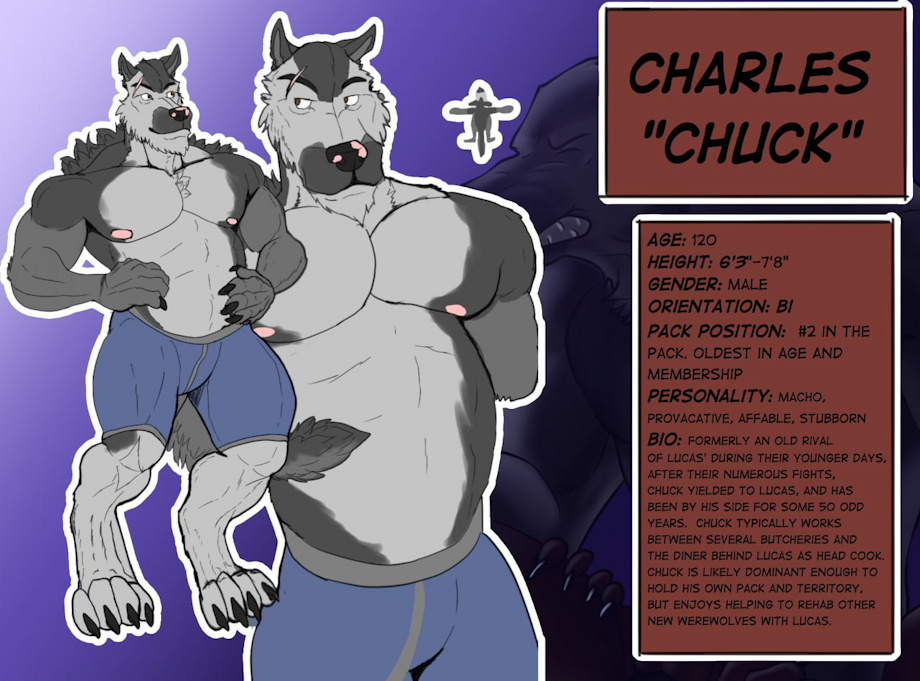 The second in command of Lucas' pack and the oldest wolf of the lot. Chuck is dominant enough to hold his own pack, but due to his long rivalry with Lucas' he ended up sticking close enough to eventually just join up. He's bigger than Lucas, and gruff, but the type that'll crack open a beer and cuddle for a night. https://www.furaffinity.net/view/6784925/