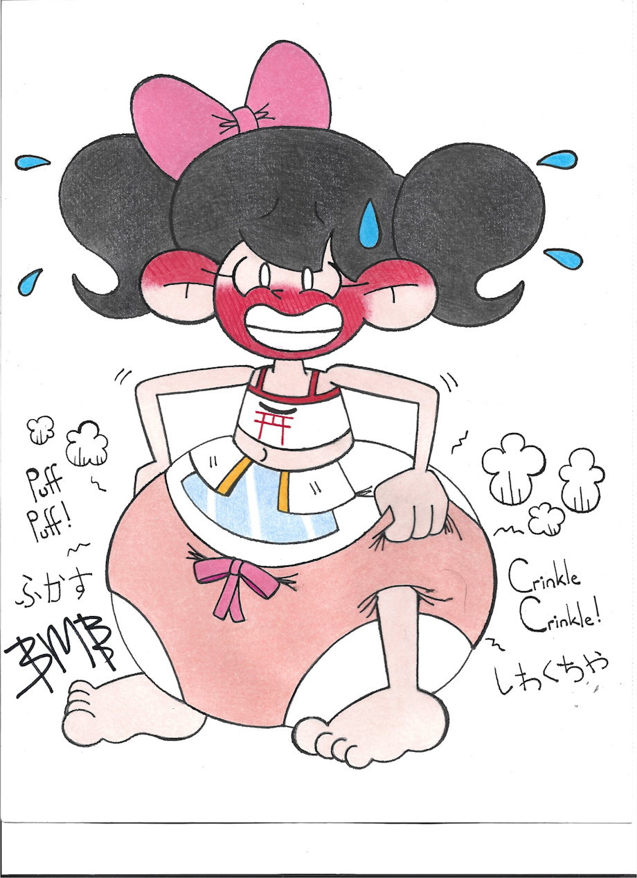 Momoko struggling to wriggle her undies up over her massive diaper, she'll struggle even more with her pajama shorts!